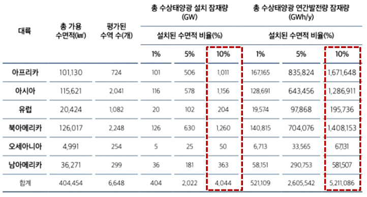 WORLD BANK´Â 6³â ÀüÀÎ 2018³â ¡°¼¼°è ¼ö»óž籤 ½ÃÀ庸°í¼¡±¸¦ ÅëÇØ ´ã¼öÀÇ 10%¿¡ ¼ö»óž籤À» ¼³Ä¡ÇÒ °æ¿ì ¿øÀÚ·Â ¹ßÀü¼Ò 4,044°³¸¦ ¼³Ä¡ÇÏ´Â °Í°ú °°Àº 4,044GWÀÇ Ä£È¯°æ ¹ßÀü¼Ò¸¦ ¸¸µé ¼ö ÀÖ´Â °³¹ßÀáÀç·ÂÀÌ ÀÖ´Ù°í ¹ßÇ¥ÇÏ¿´À¸¸ç, ´ë·úº° °³¹ßÀáÀç·®°ú ¿¬°£ ¹ßÀü·®À» ¾Æ·¡¿Í °°ÀÌ Á¦½ÃÇÏ¿´´Ù.